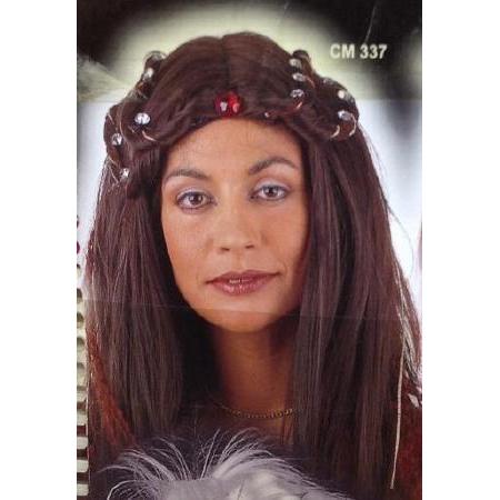 Cabeça com peruca castanha longa e lisa com enfeites vermelhos e brancos
