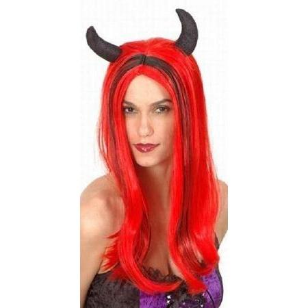 Peruca vermelha e preta com asas de diabo pretas no fundo branco