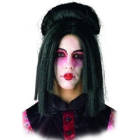 Peruca sintética preta estilo vintage com volume e maquilhagem dramática