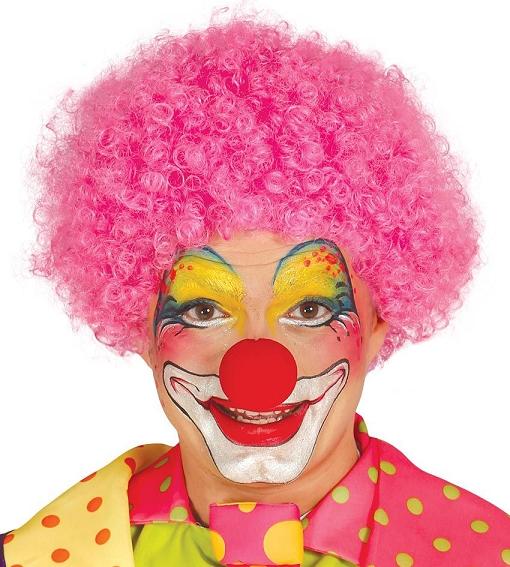 Peruca rosa cacheada de palhaço com maquilhagem colorida e camisa rosa com bolinhas amarelas