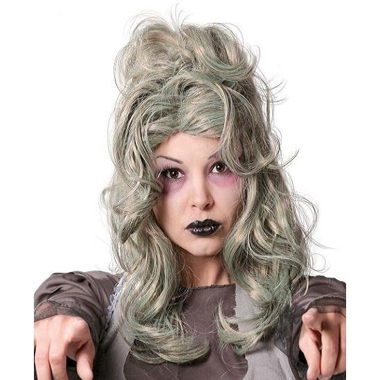 Mulher com peruca cinzenta ondulada e maquilhagem escura apontando com os dedos