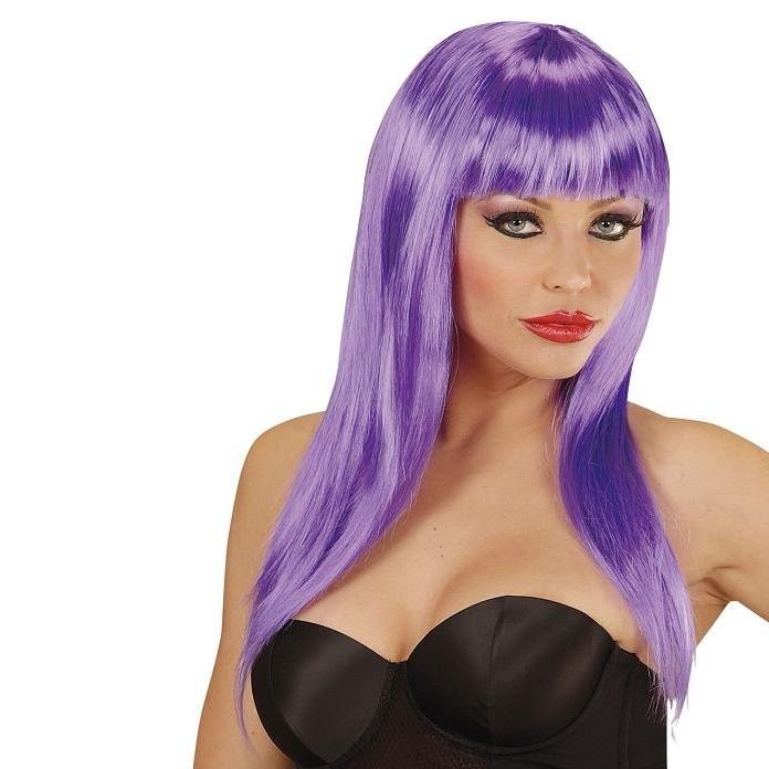 Peruca roxa lisa e comprida com franja reta numa modelo vestida de preto