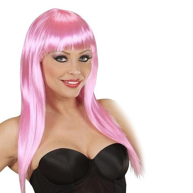 Peruca sintética cor-de-rosa clara com corte longo e franja reta