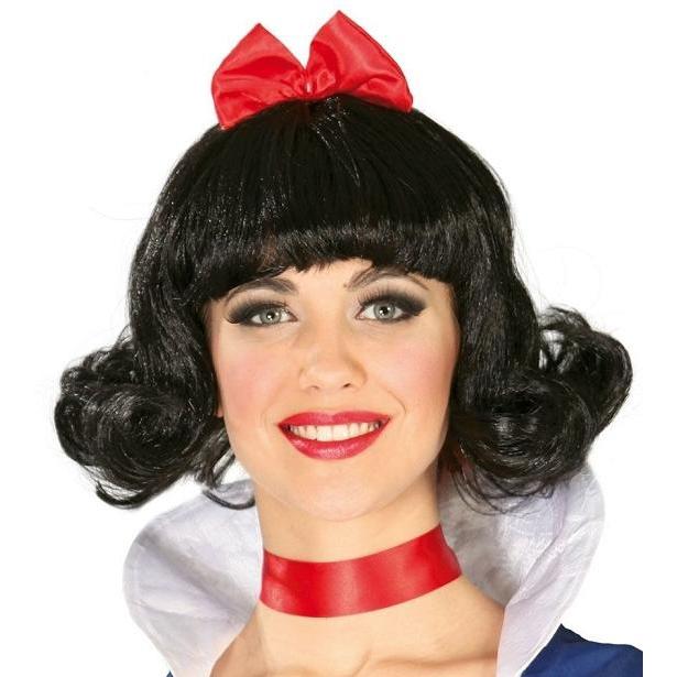 Mulher com peruca preta curta ondulada, laço vermelho e gargantilha vermelha