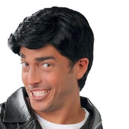 Homem com peruca preta curta e lisa e jaqueta preta brilhante