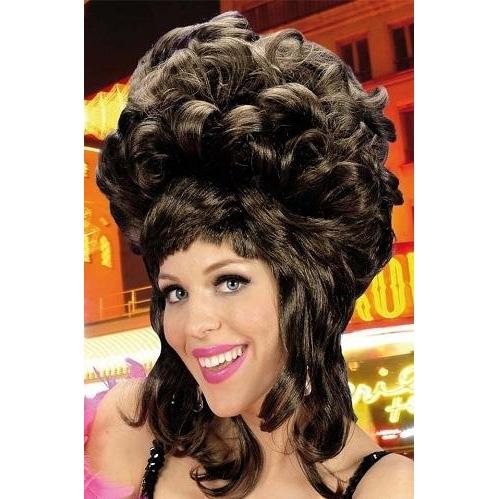 Mulher com peruca castanha volumosa cacheada e franjas num cenário urbano iluminado à noite