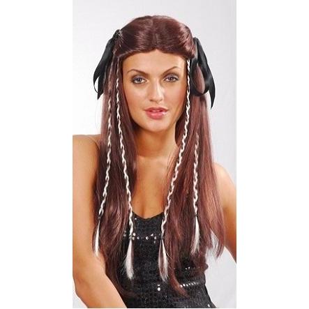 Mulher com peruca castanha comprida com tranças brancas e fitas pretas