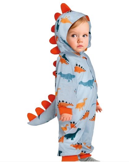 Bebé com fato de dinossauro azul com capuz e cauda laranja