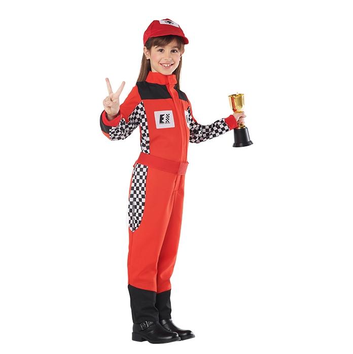 Criança com macacão de corrida vermelho e preto e branco com boné vermelho a segurar troféu dourado