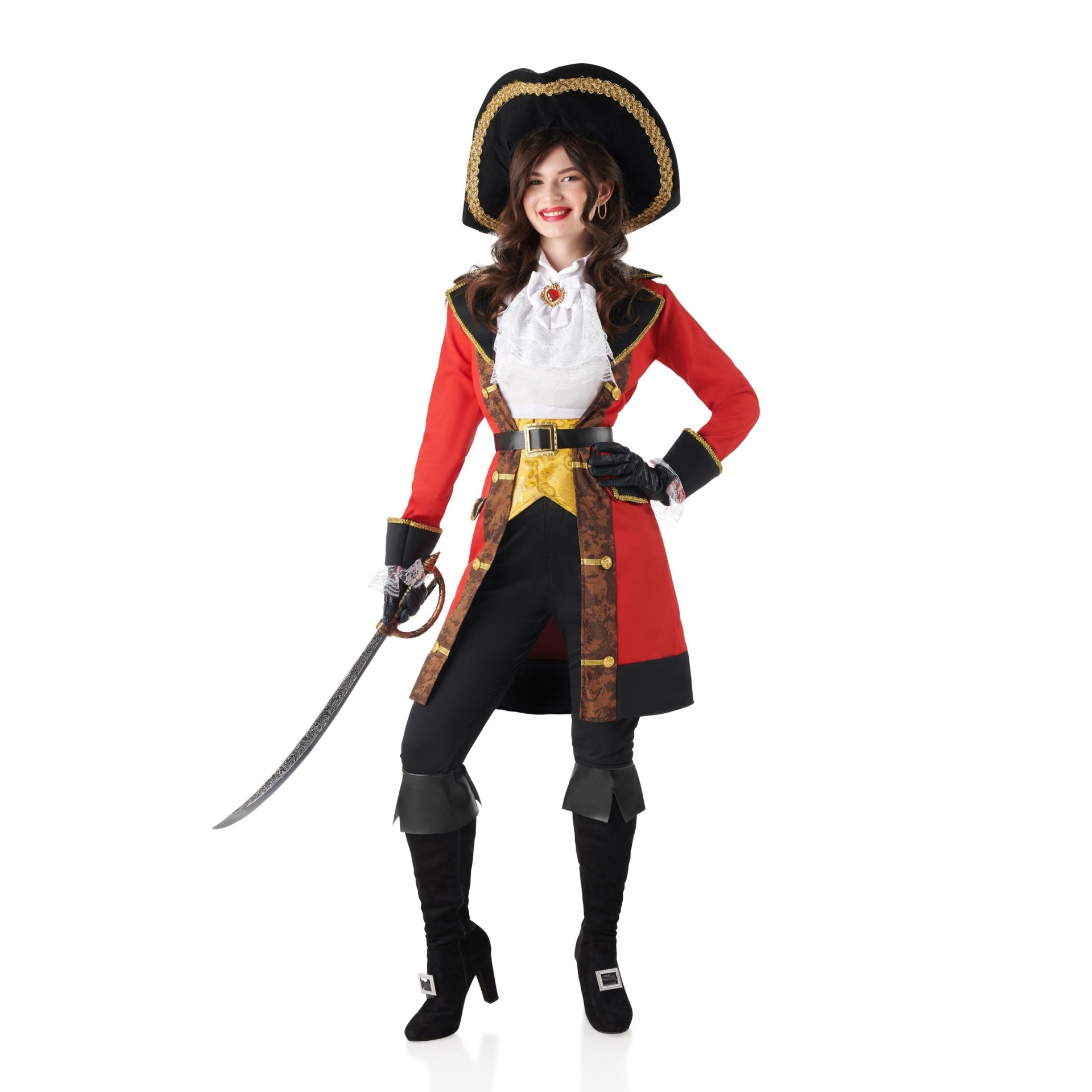 Mulher vestida com fantasia de pirata com casaco vermelho e chapéu tricórnio preto