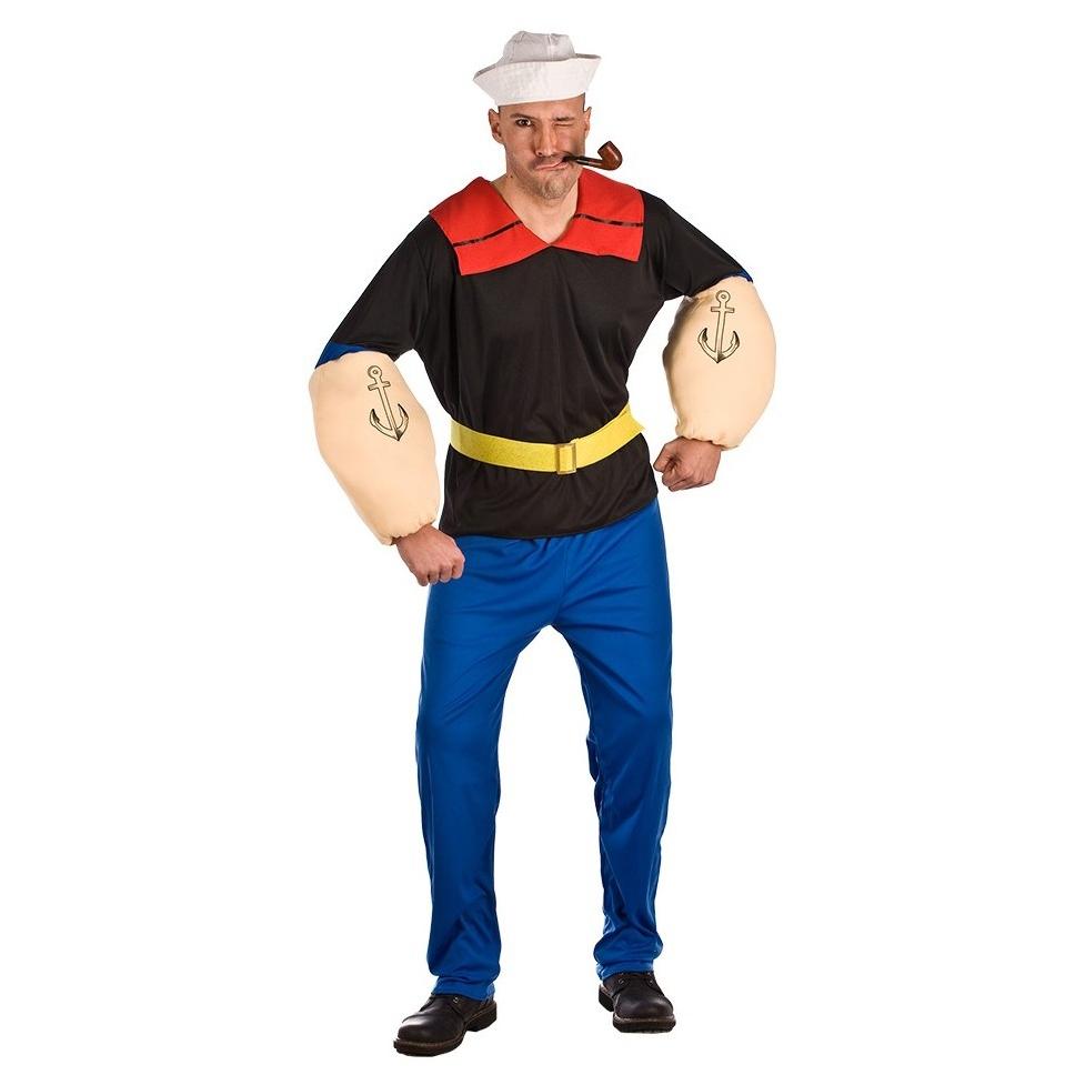 Fato de marinheiro com mangas almofadadas, chapéu branco e cachimbo.