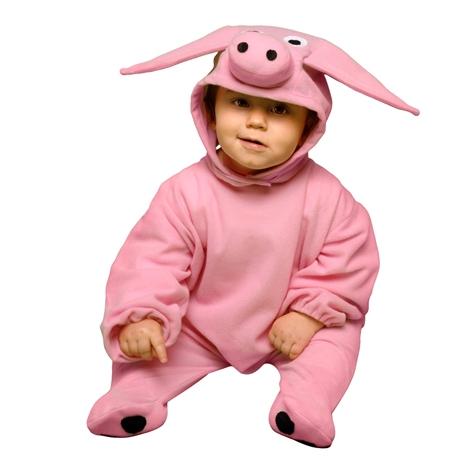 Bebé com fato rosa de porquinho com capuz e orelhas grandes