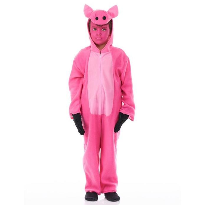 Criança em macacão rosa de fantasia de porco com capuz e orelhas, luvas e sapatos pretos