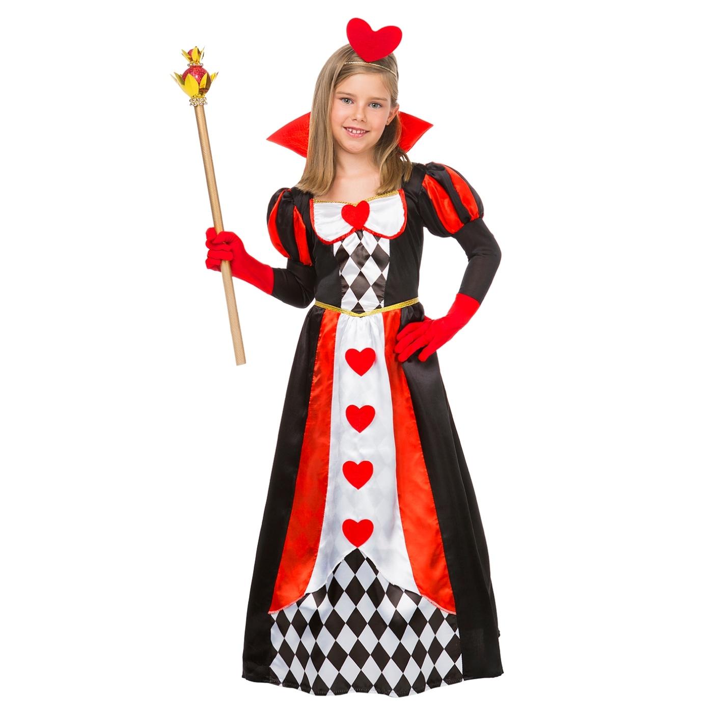 Criança vestida de rainha de copas com cetro e coroação vermelha