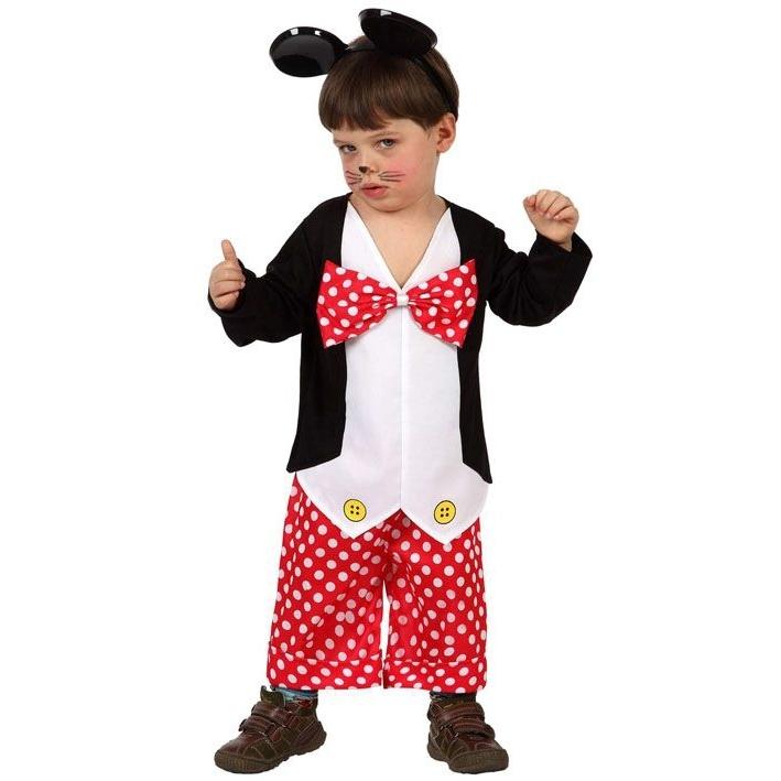 Criança com fato de rato com calças vermelhas de bolinhas brancas e orelhas negras.