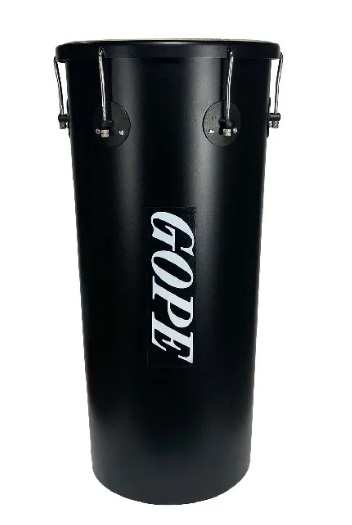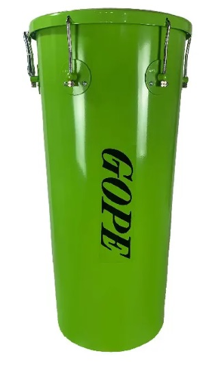 Tambor verde de metal com palavra GOPE preta na frente