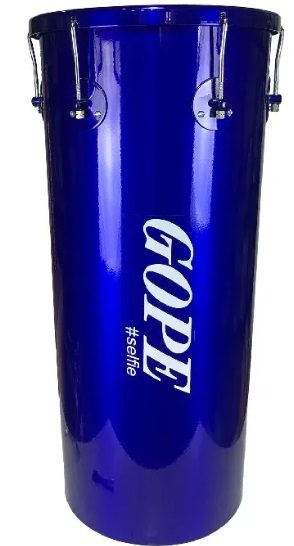 Tambor azul brilhante com texto GOPE e #selfie