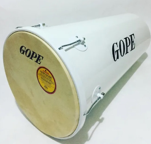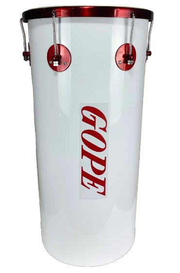 Tambor branco com detalhes vermelhos e inscrição GOPE