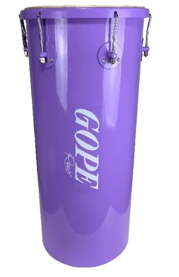 Tambor roxo para percussão com ferragens metálicas e texto GOPE na vertical