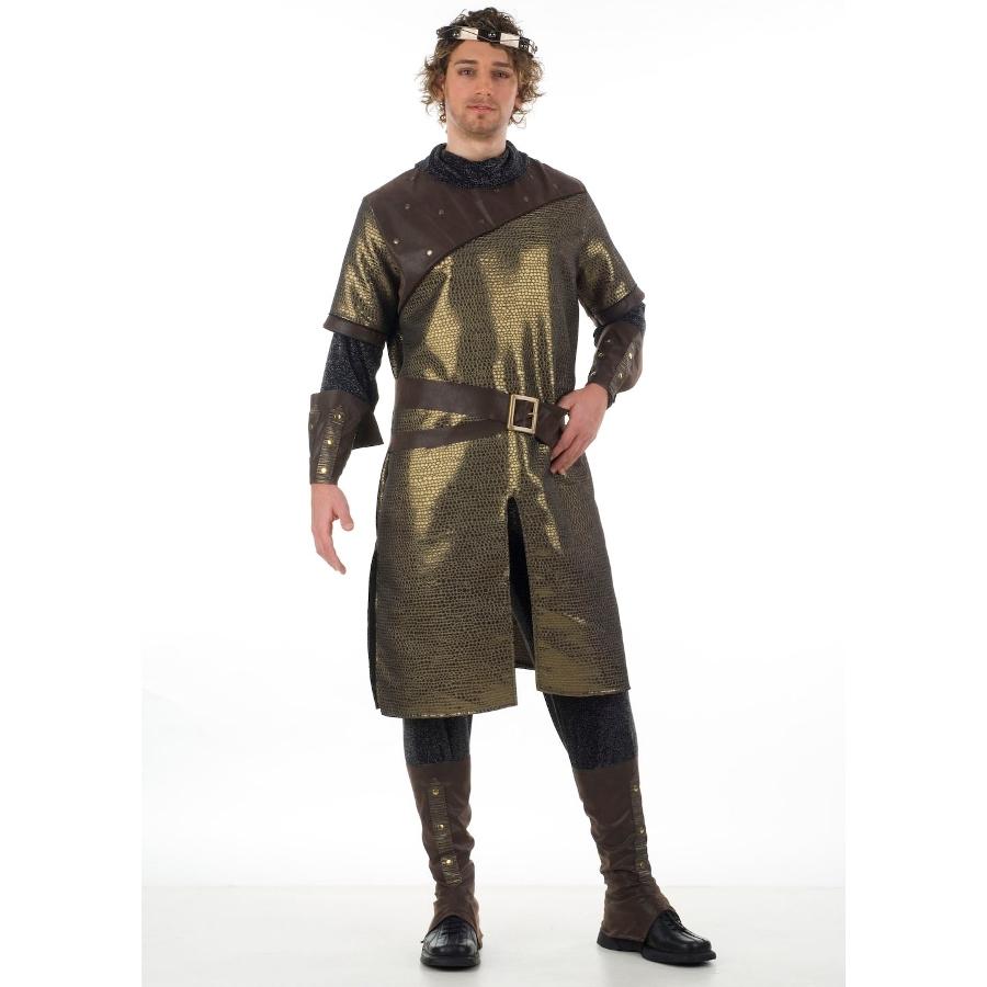 Traje medieval dourado e castanho para cavaleiro com coroa prateada