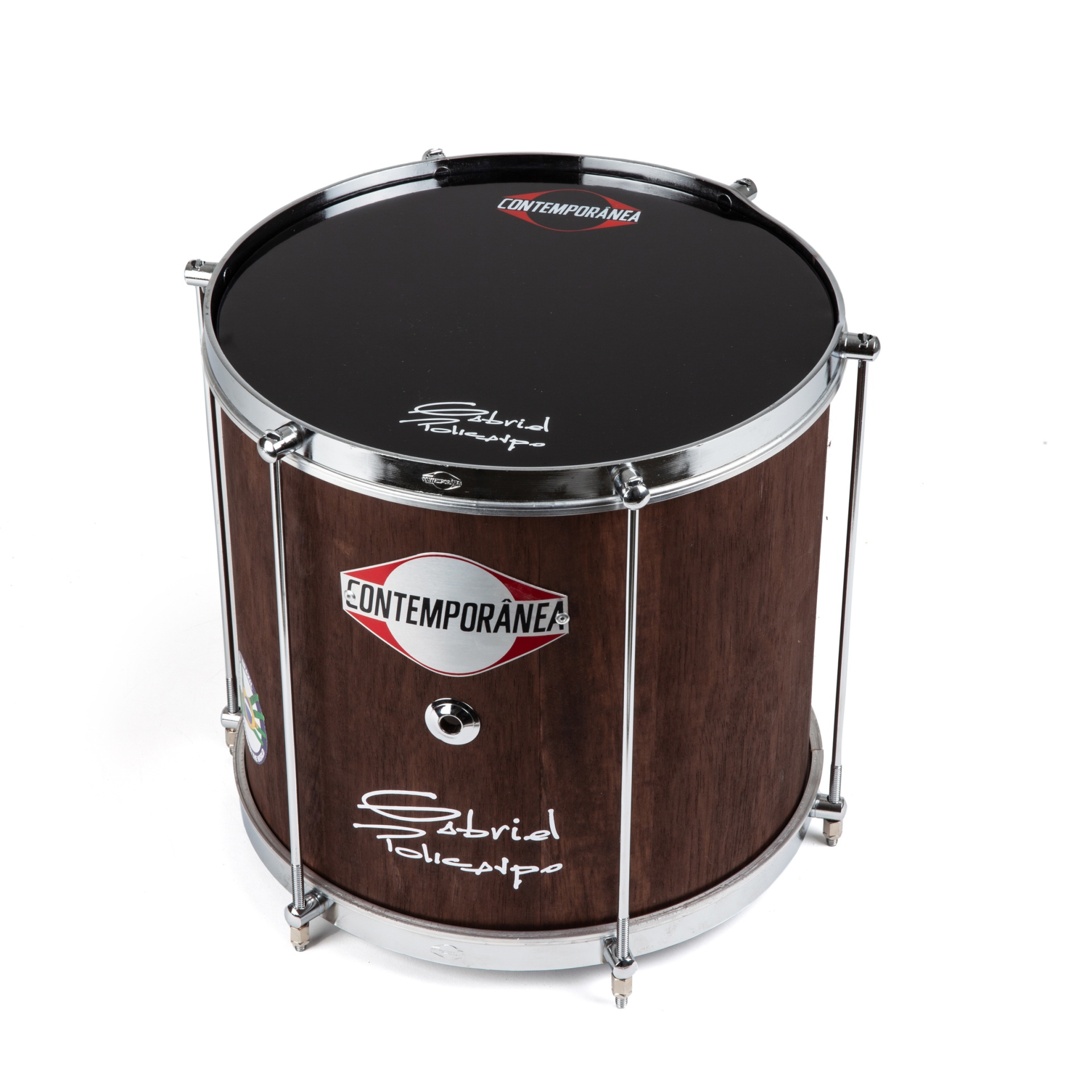 Tambor de madeira castanho escuro com pele preta e texto CONTEMPORÂNEA e Gabriel Teixeira