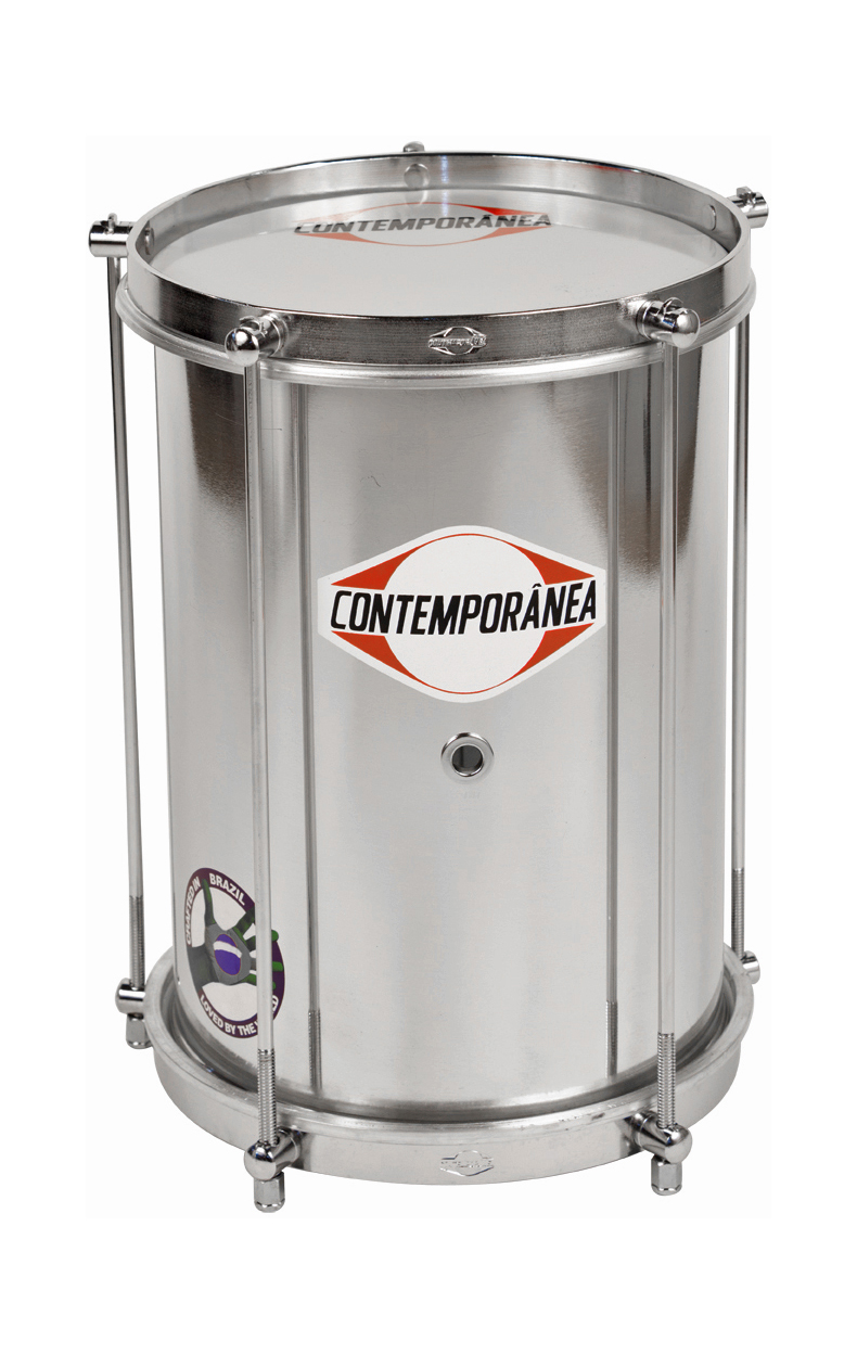 Tambor de aço inox prateado com parafusos e marca CONTEMPORÂNEA