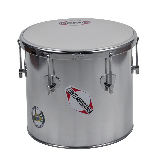 Tambor Contemporânea de metal prateado com pele branca e logótipos