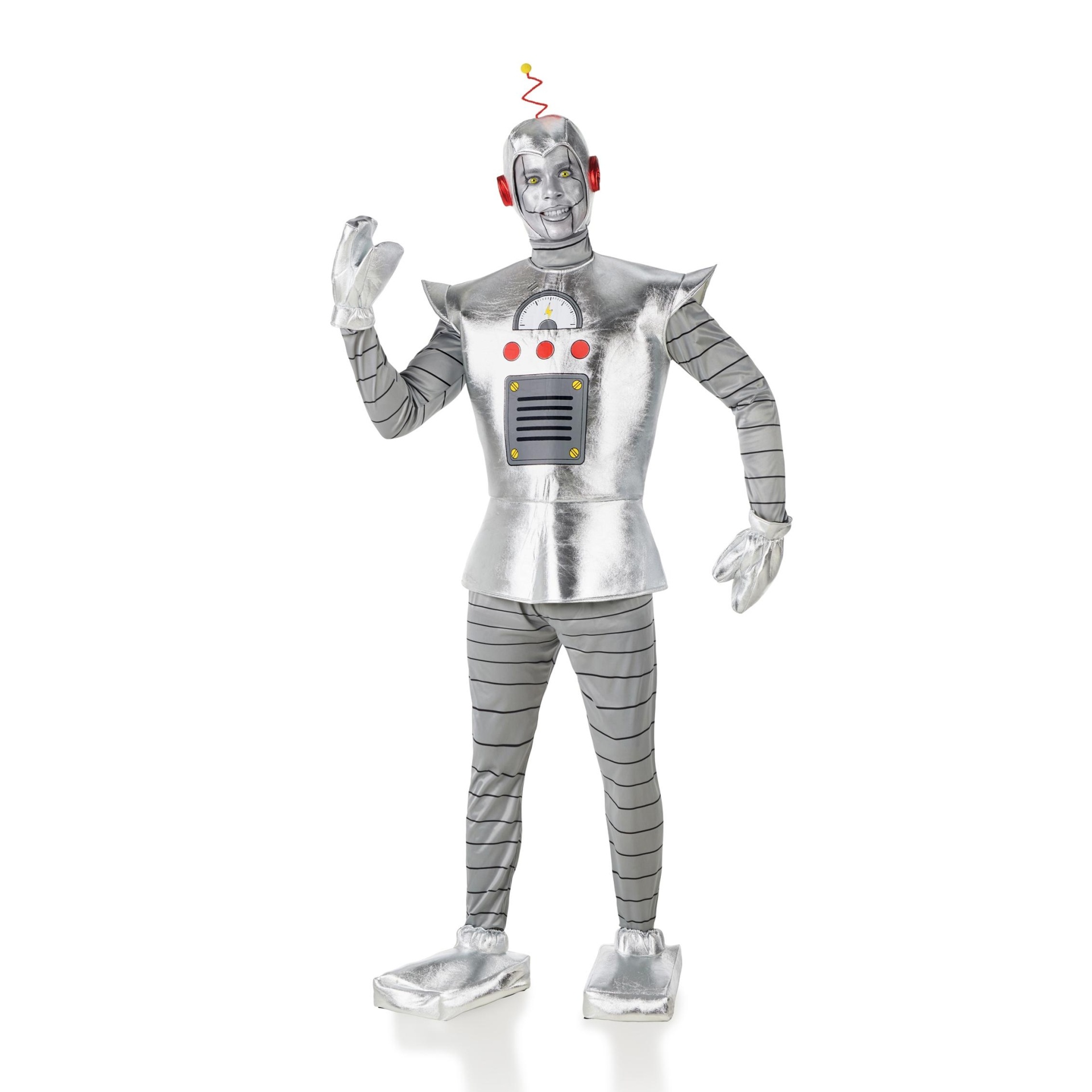 Fantasia de robô metálico prateado com antena e detalhes vermelhos