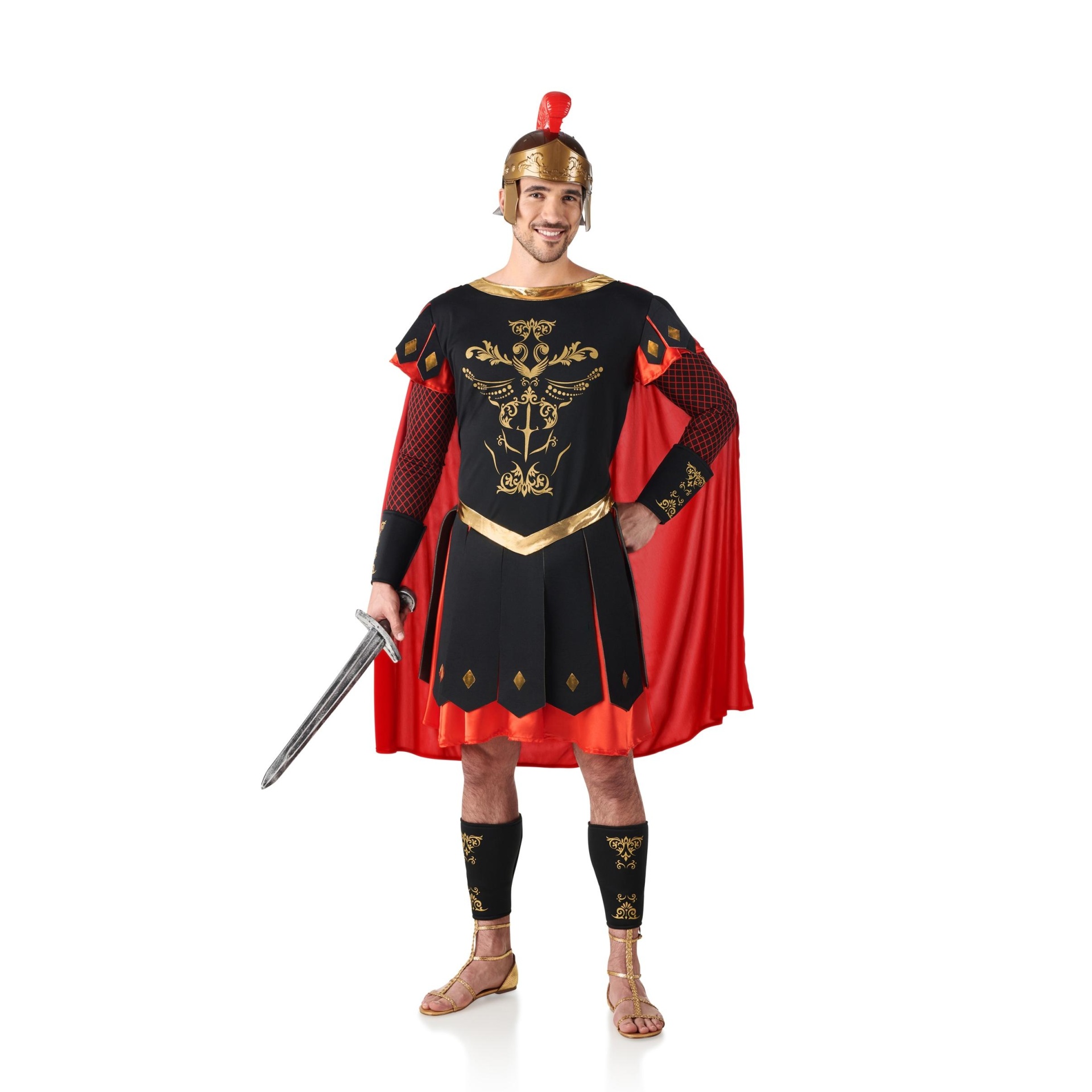 Fato de gladiador romano com capa vermelha e capacete dourado