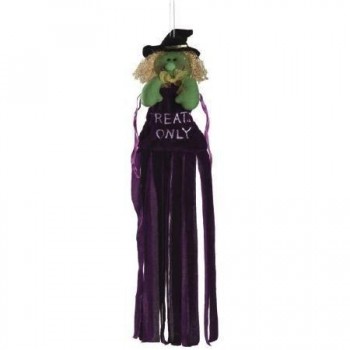 Boneca decorativa verde com chapéu preto e vestido roxo com texto