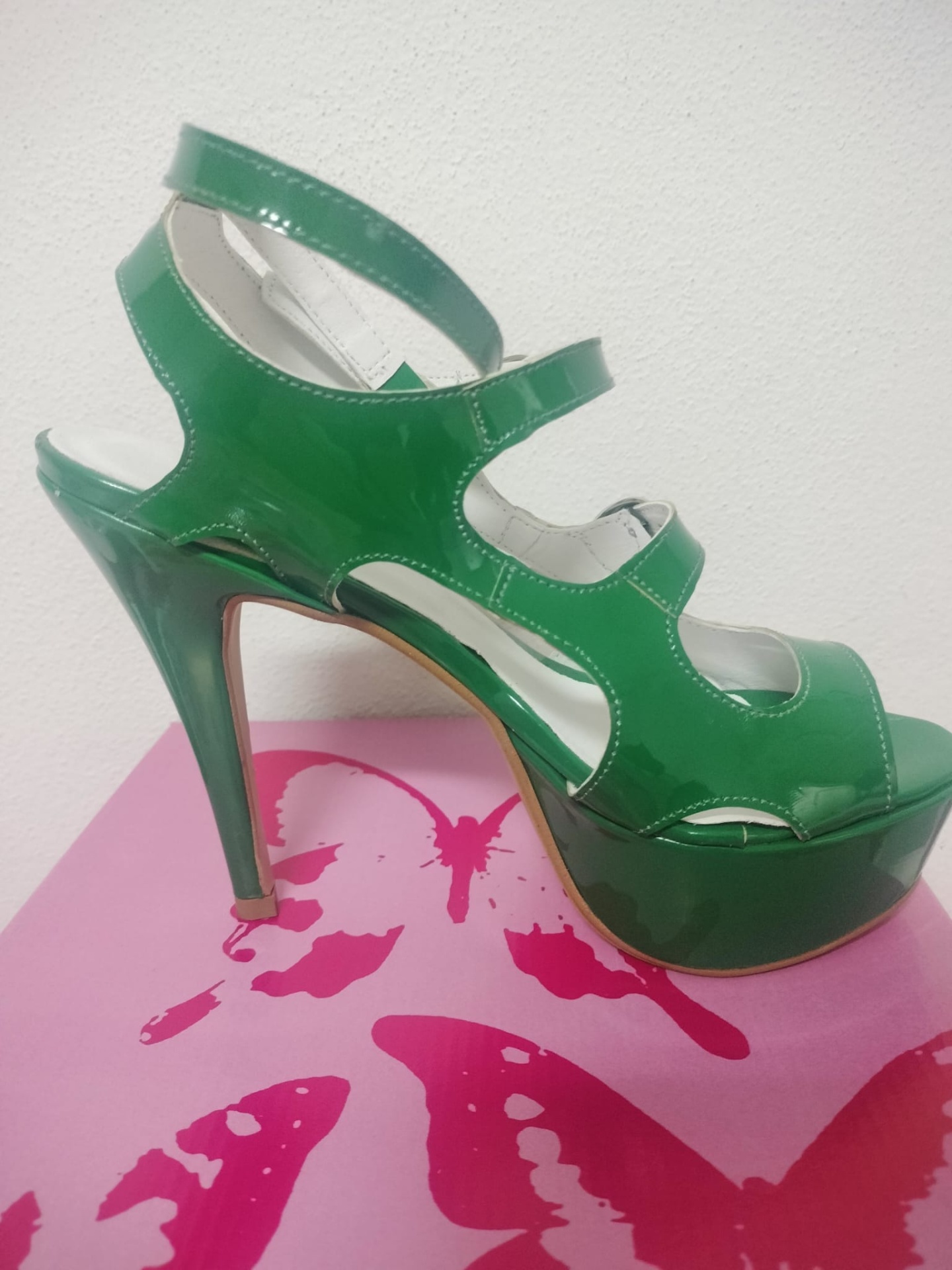 Sandália verde de salto alto e plataforma sobre caixa rosa com borboletas