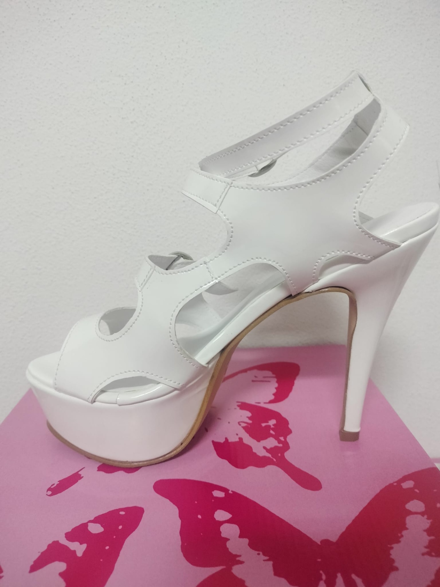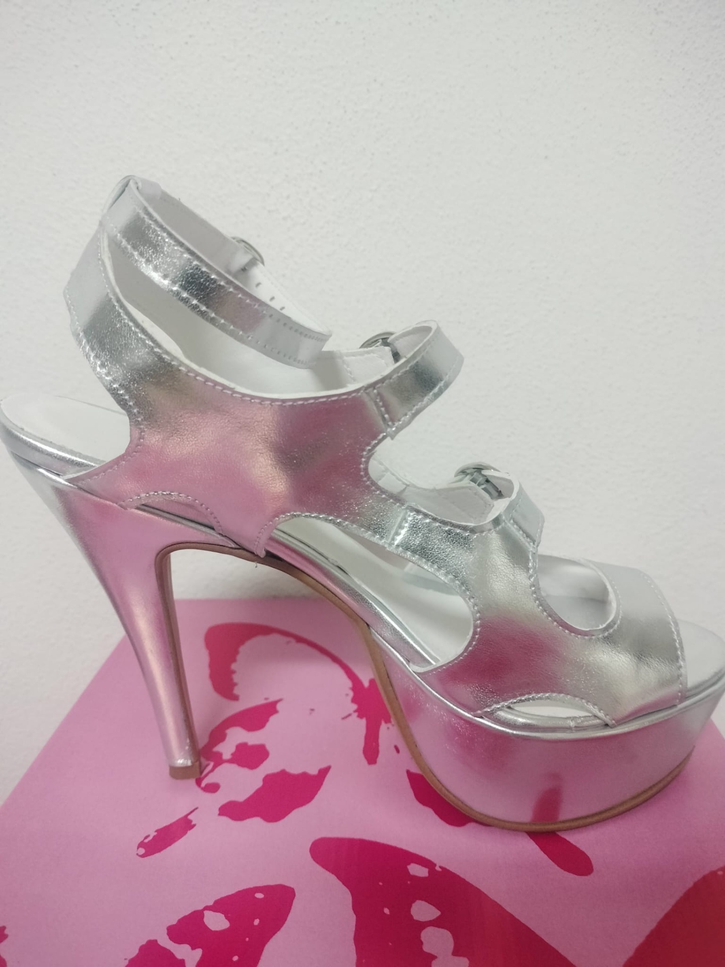 Sandália prateada de salto alto com tiras ajustáveis sobre caixa cor-de-rosa com borboleta vermelha