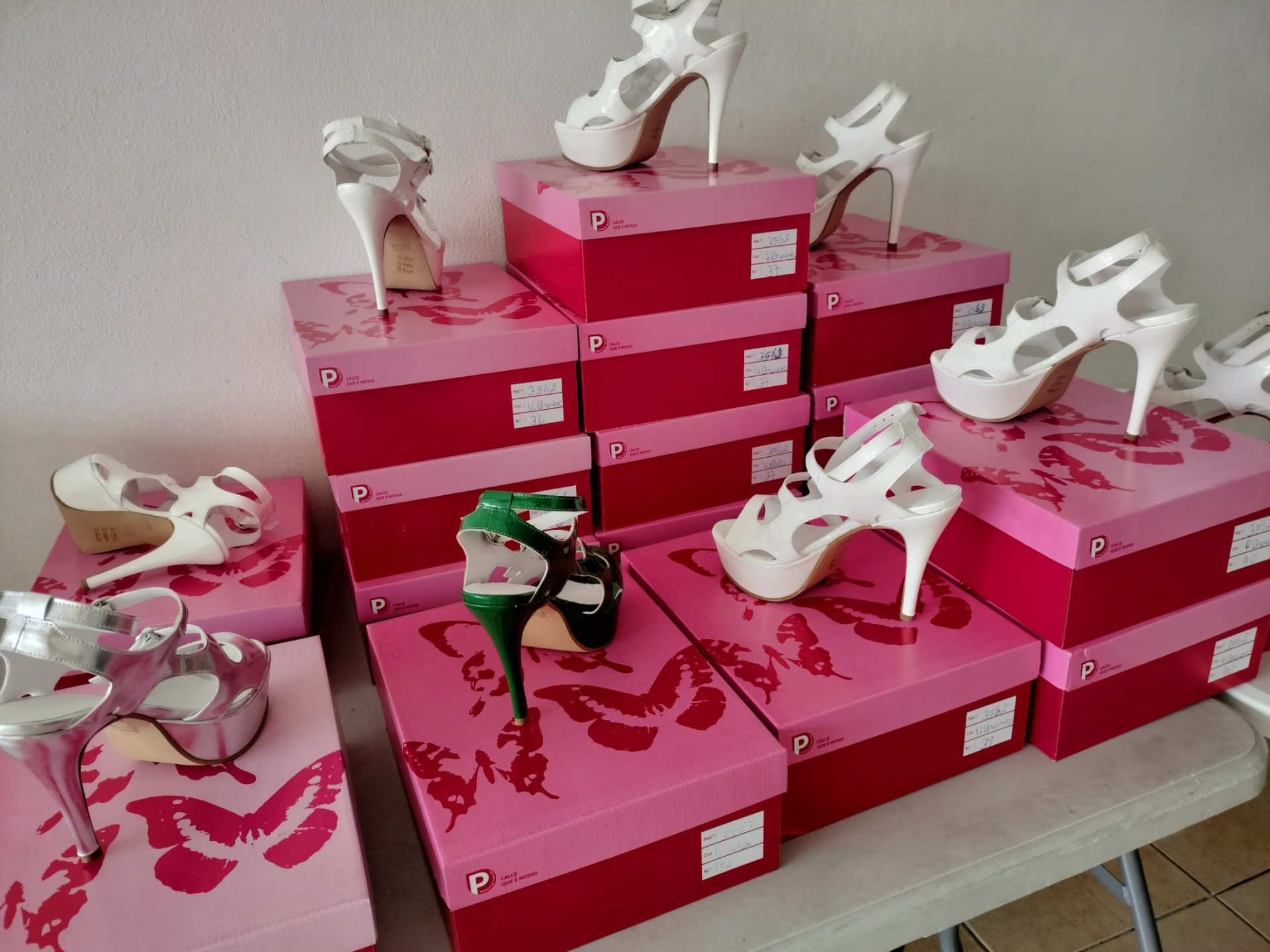 Sapatos de salto alto femininos variados em caixas cor-de-rosa