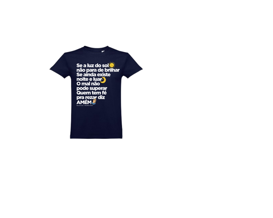 T-shirt azul escura com texto e emojis religiosos em branco