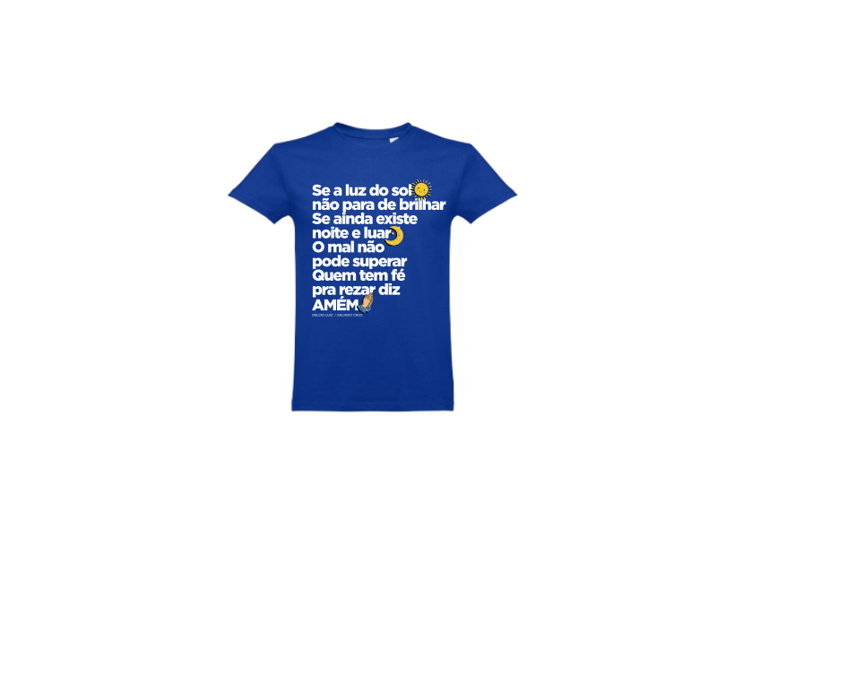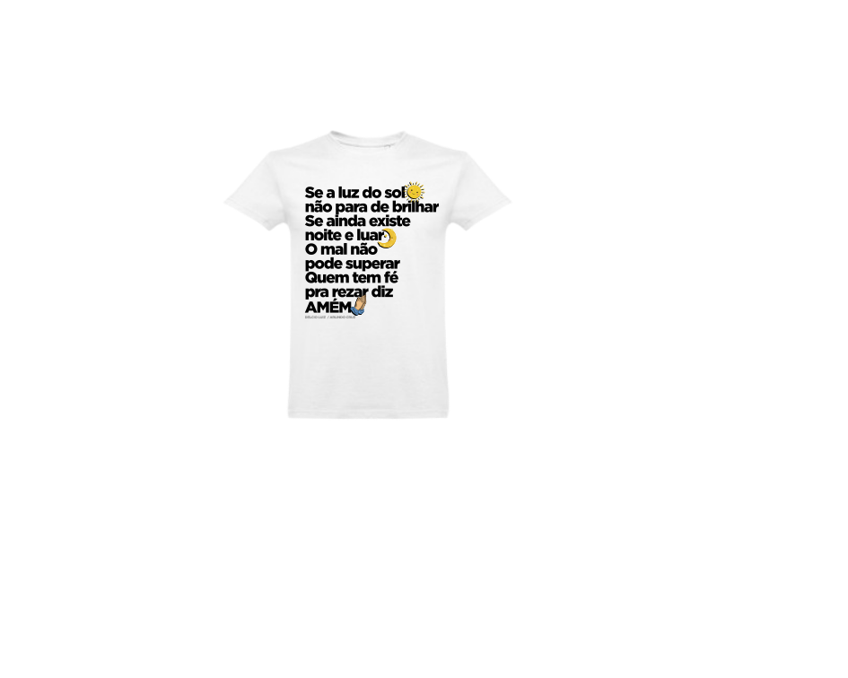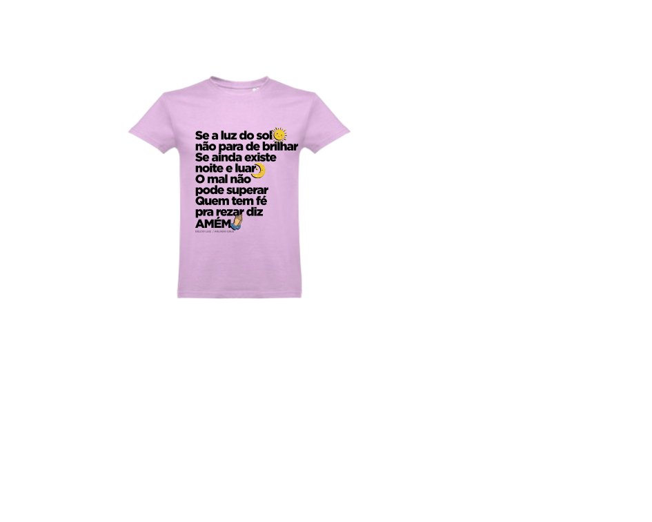 T-shirt lilás com texto em português e símbolos de sol, lua e mãos a orar