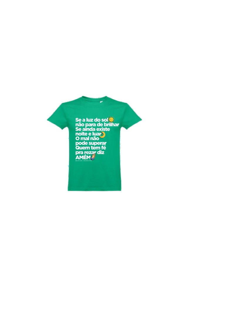 T-shirt verde com texto inspirador e ícones de sol, lua e mãos a rezar