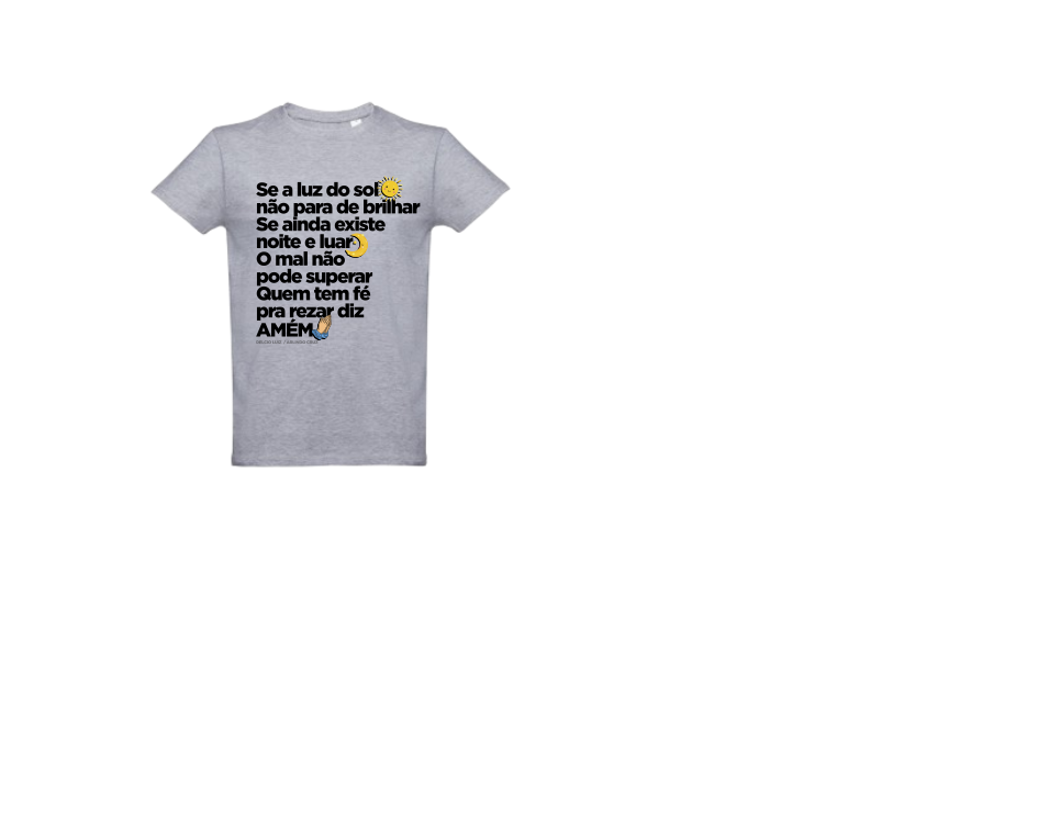 T-shirt cinzenta com texto e símbolos do sol, lua e mãos a rezar na frente