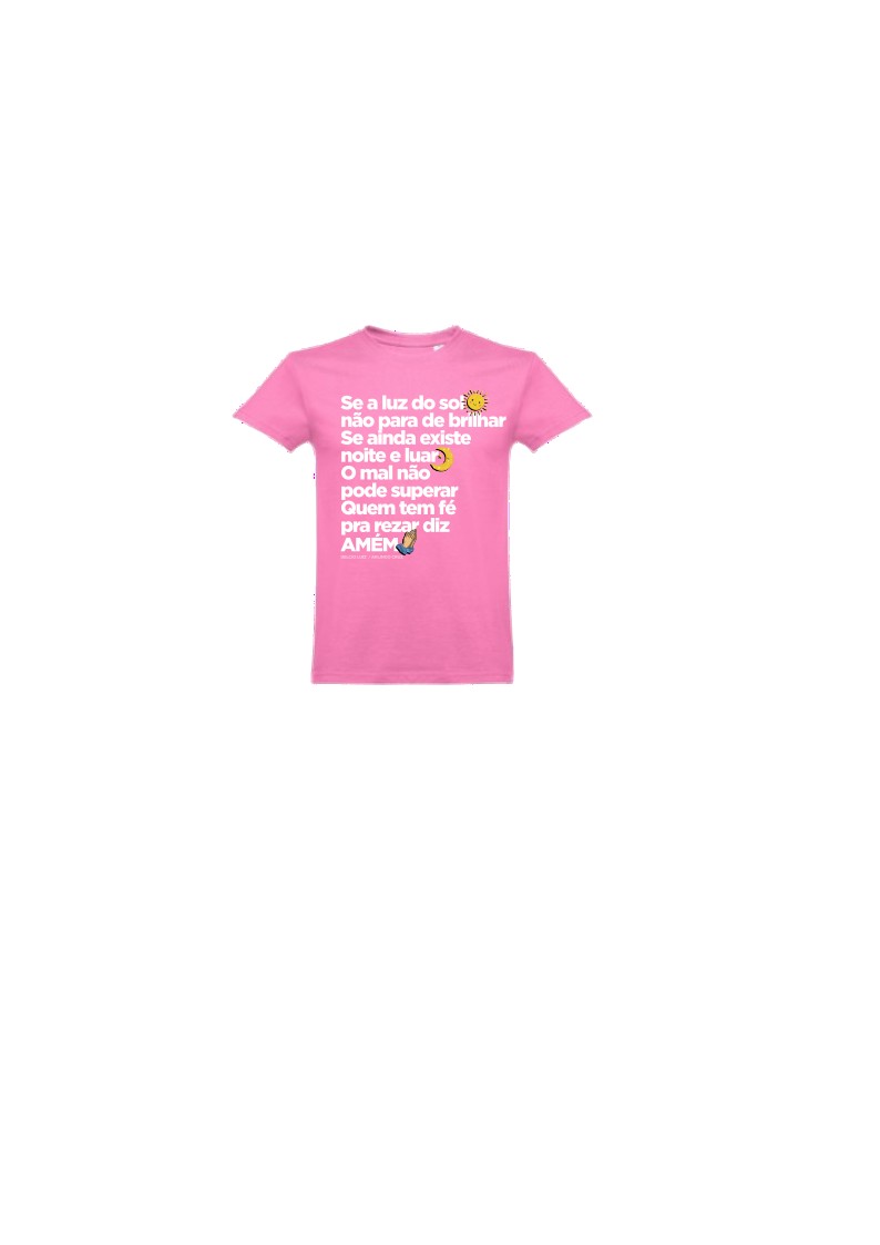 T-shirt rosa com texto branco em português e emojis sol, lua e oração