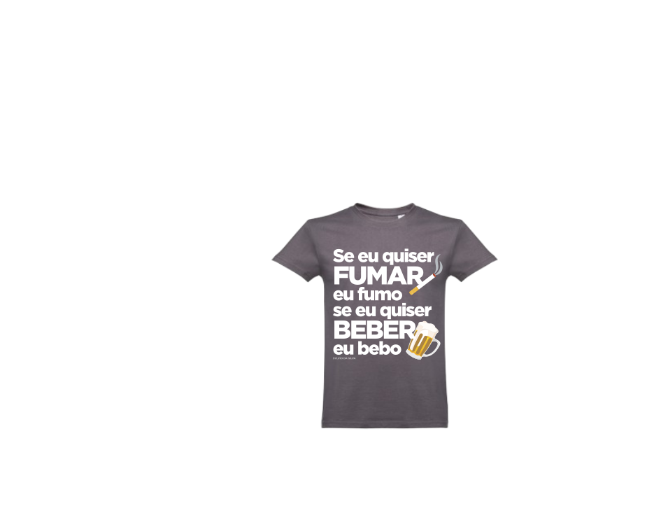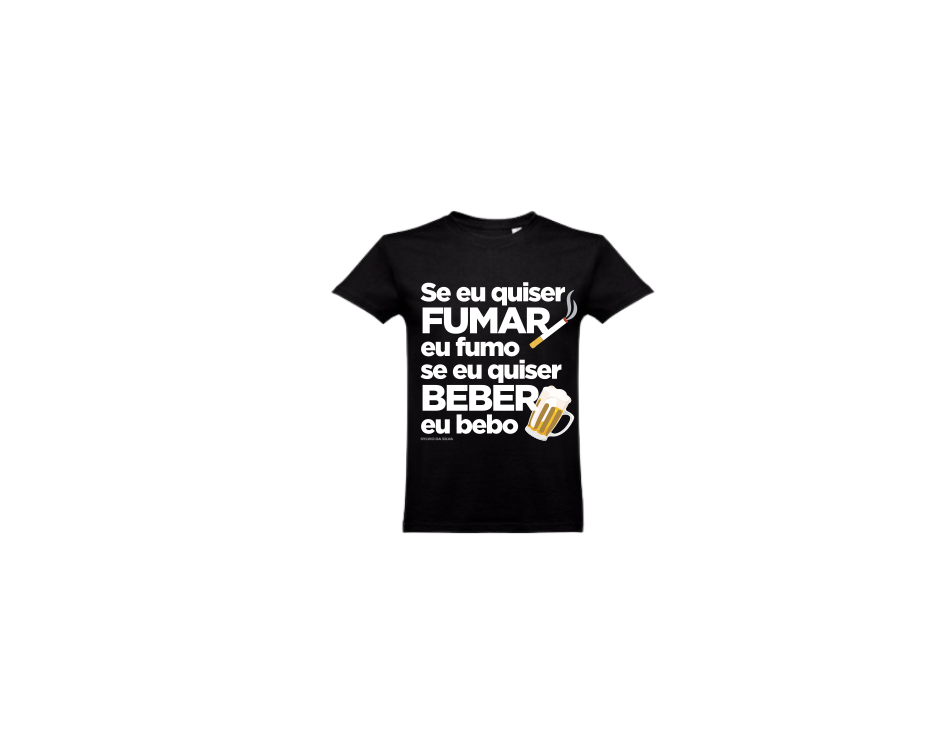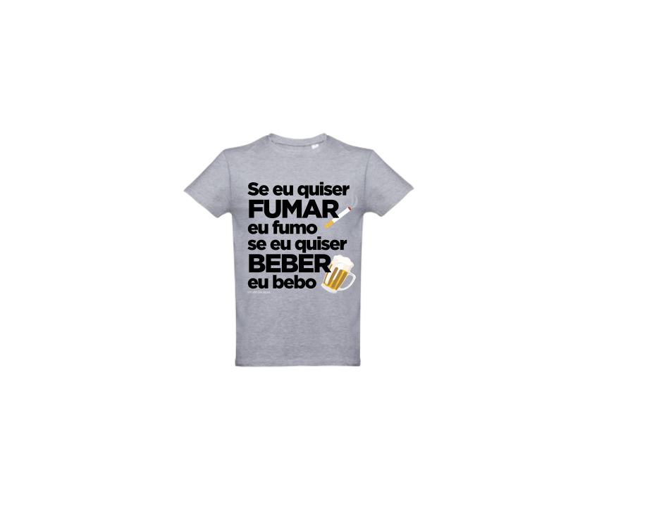 T-shirt branca com texto em português e imagens de cigarro e cerveja