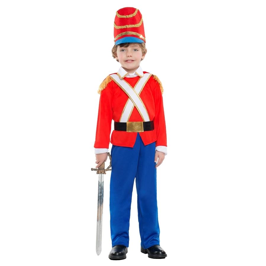 Fato de soldado infantil vermelho e azul com chapéu e espada de brinquedo