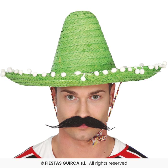 Homem com chapéu sombrero verde em palha e bigode falso preto