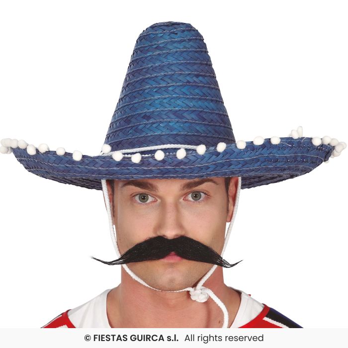 Homem com sombrero azul e bigode falso