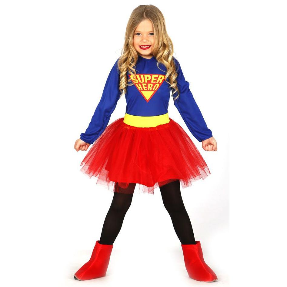 Criança com fato de super-herói azul e vermelho com saia de tule e botas vermelhas