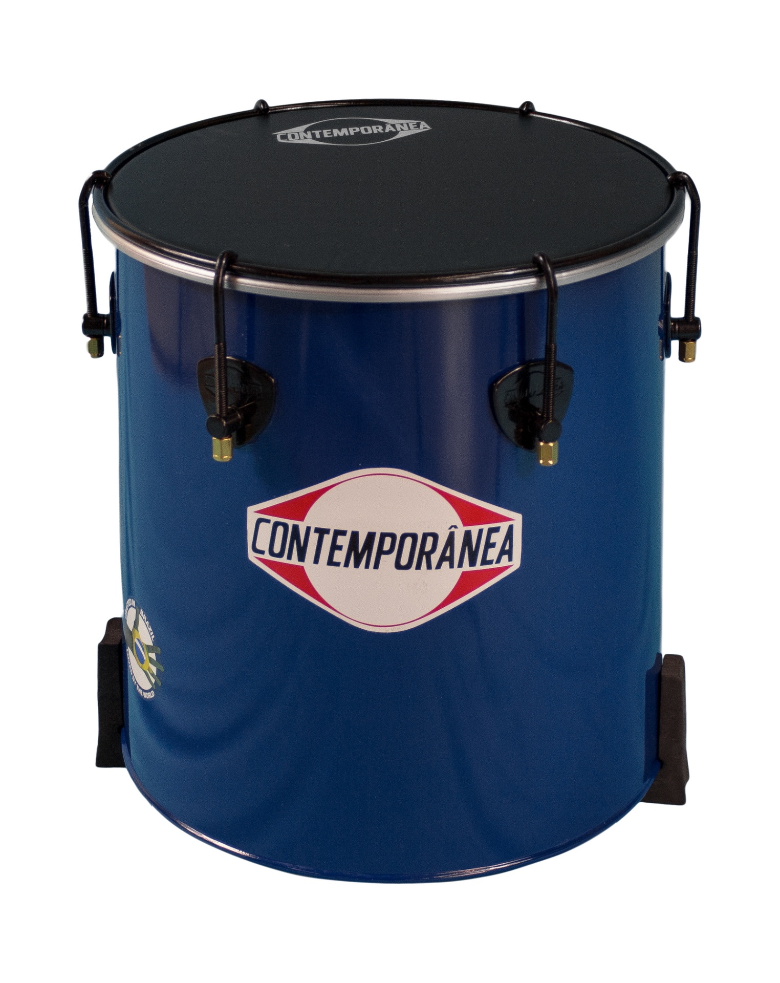 Tambor azul com pele preta e logótipo CONTEMPORÂNEA