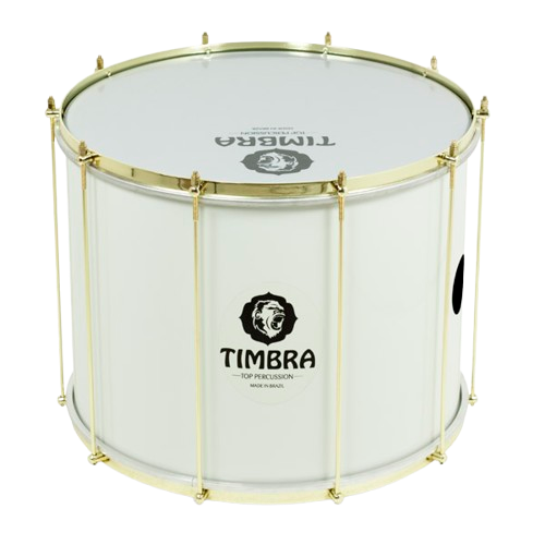 Bombo branco com aros e hastes douradas, marca TIMBRA e logotipo de leão