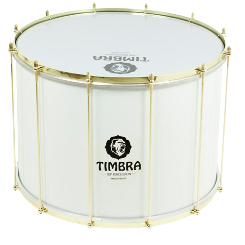 Tambor de percussão branco com estrutura metálica dourada e logo TIMBRA