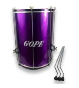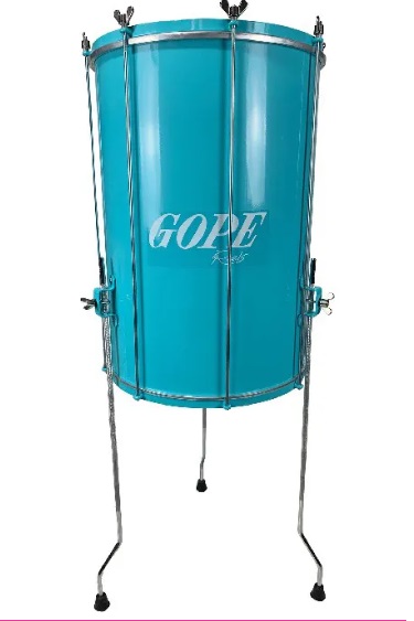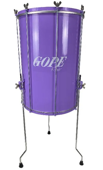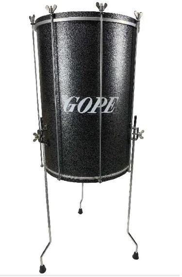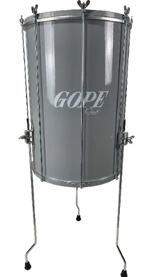 Tambor surdo preto com estrutura metálica cromada e a palavra GOPE.