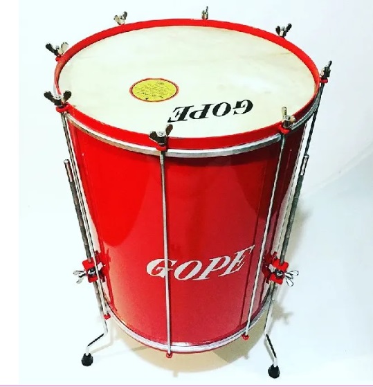 Caixa de percussão vermelha com detalhe em metal e texto GOPE