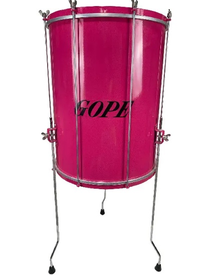 Tambor rosa com marca preta GOPE e suporte metálico prateado