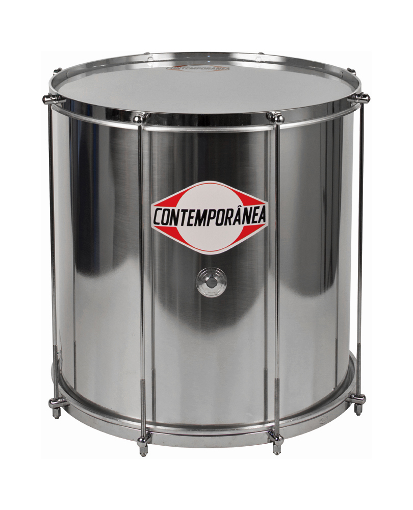 Tambor metálico prateado com logo CONTEMPORÂNEA